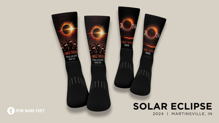 What: Sock sale & FREE parking/viewing areas for the upcoming Total Solar Eclipse in Martinsville, IN at For Bare Feet.